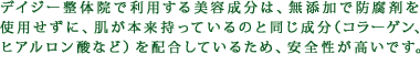 さんの美容成分は、無添加で防腐剤を使用せずに、肌が本来もっているのと同じ成分(コラーゲン、エラスチン、ヒアルロン酸、セラミドなど)を配合しているため、安全性が高いです。
