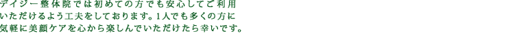 デイジー整体院では、1人でも多くの方に気軽に美顔ケアをご体験いただきたいと考えております。ご体験コースを受けたからといって継続をしつこく勧誘することはありませんので安心してご体験コースをご利用ください。